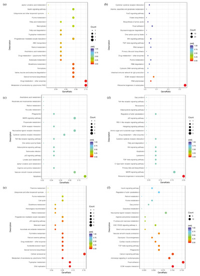 KEGG analysis of DEGs in different salinity comparison groups. (a) Smsh vs. Smsc dot plot of up-regulated DEGs; (b) Smsh vs. Smsc dot plot of down-regulated DEGs; (c) Smsh vs. Smsl dot plot of up-regulated DEGs; (d) Smsh vs. Smsl dot plot of down-regulated DEGs; (e) Smsl vs. Smsc dot plot of up-regulated DEGs; and (f) Smsl vs. Smsc dot plot of down-regulated DEGs.