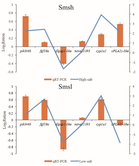 To verify the accuracy of the transcriptome data, six DEGs were selected for qRT-PCR validation (Figure 7). The curves are based on the transcriptome results, and the bars are based on the qRT-PCR results. The results show that the expression trends of qRT-PCR results are consistent with those of RNA-Seq, indicating the reliability of the transcriptome sequencing results. In addition, the expression trends of different genes at different salinities were specific, either based on transcriptome or qRT-PCR, where the gene expression of pik3r6b, novel.1593, cyp1a1, and fgf10a increased with increasing or decreasing salinity, and the gene expression of dlgap1-like decreased with increasing or decreasing salinity. The expression of cPLA2γ-like genes increased with increasing salinity and decreased with decreasing salinity.