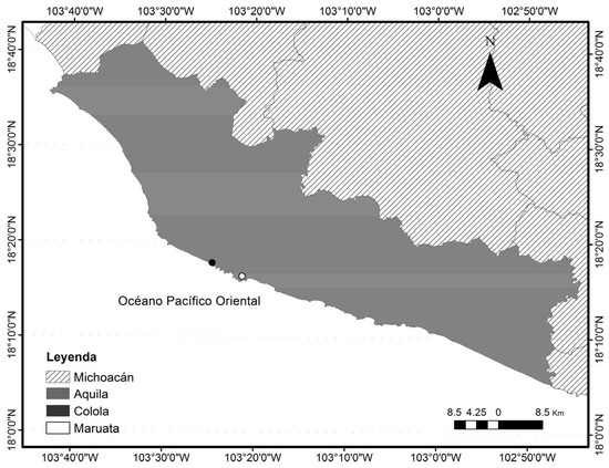 To determine black turtle life history traits for the nesting population in Colola, Mexico (18°30′0′-18°0′0′N, 103°40′0′-102°50′0″W) (Figure 1), morphometric and reproductive annual data from 15 nesting seasons (1985–2000) which included between 3 and 5 remigratory events (the 1992 season was not included due to insufficient data) were obtained from the Black Turtle Ecological Recovery Projects database for Colola Beach, Mexico.
