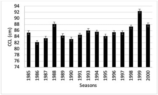 Temporal changes in body size (CCL) of black turtles (1985–2000).