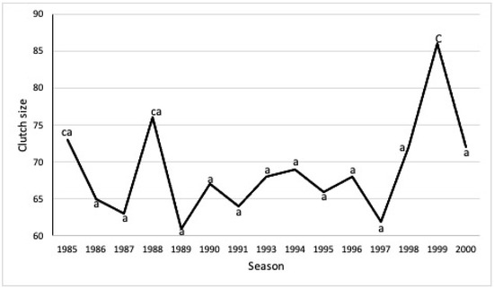 Tukey’s mean differentiation analysis showed significant differences between the mean clutch size of 1999 and the rest of the seasons (p < 0.001) except for 1985 and 1988, for which there were no significant differences (p > 0.001). The 1988 season also presented significant differences (p < 0.001) from 1989 and 1987 (Figure 4).