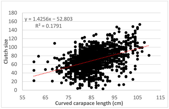 Linear regression between female curved carapace length and clutch size for C. m. agassizii (n = 1500) at Colola Beach, Mexico.
