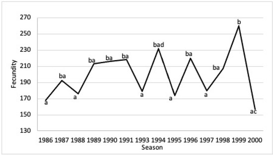 C. m. agassizii mean fecundity during 14 nesting seasons (1986–2000) at Colola Beach, Mexico. The letters indicate significant differences between the years analyzed.