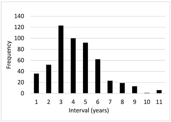 A total of 528 nesting female remigration events were registered between 1985 to 2000 with intervals of 1 to 11 years. The most frequent interval was three years (23.2%), followed by intervals of four years (18.9%), five years (17.4%) and six years (11.7%) (Figure 7), with the rest having remigration intervals of one, two, seven, eight, nine and ten years (21.2%).