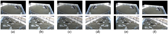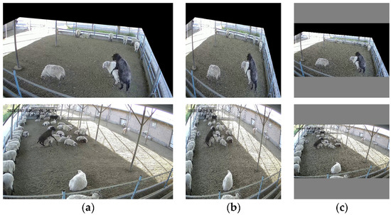 When we watched the video image of ewe estrus, we found that the video image taken by camera 2 contained more unrelated areas. In the process of ewe estrus detection, these more unrelated regions will increase the amount of calculations required and error recognition rate. On the one hand, the video shooting position and camera rotation angle are fixed; on the other hand, the ewes’ activity range is within the shaded area; therefore, there is no ewe estrus crawling behavior occurring outside the shade area. In summary, in order to reduce the computation and detect interference, we removed the redundant irrelevant regions in the video screen using a masking method, as shown in