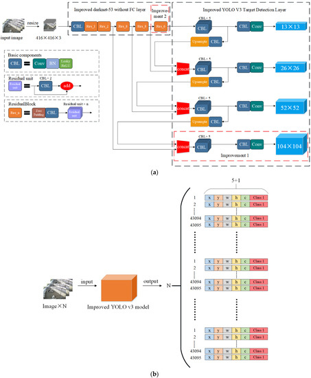 Based on the three target detection layers of the original YOLO v3 model, we added a target detection layer with a size of 104 × 104. Our improved model has four target detection layers, where the 104 × 104 target detection layer is mainly responsible for detecting small targets in video pictures.