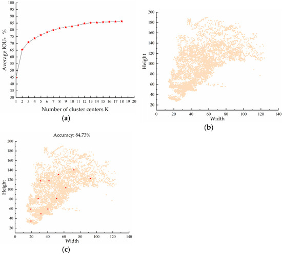 The values of the cluster center coordinates we obtained are the normalized data. Therefore, the cluster center coordinate values need to be multiplied by the size of the model input image to get the final anchor box. The input image size of the model in this paper is 416 × 416 pixels. Therefore, the clustering effect is shown in