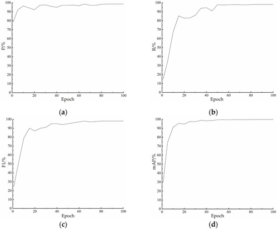 Figure 10 shows the P, R, F1, and mAP of the model at each training.