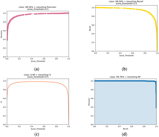 Figure 11d shows the model AP value of 99.78% at a confidence threshold of 0.5, and the mAP value of 99.78% since the dataset category was 1.