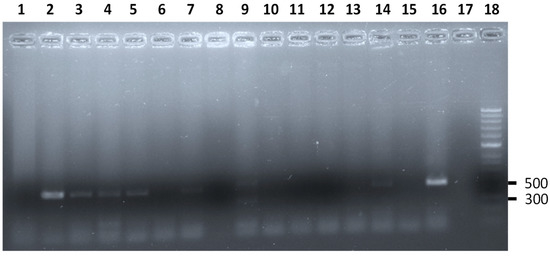Results of the m-PCR assay for the simultaneous detection of stx1 and stx2 genes of E. coli STEC from Anolis sp. analyzed. Lane 2, 3, 4, 5, 7, and 14 amplification fragments of the stx2 gene characteristic of E. coli STEC obtained from Anolis sp. analyzed in this study (516 bp). Lane 9 amplification fragments of the stx1 (302 bp) and stx2 gene characteristic of E. coli STEC obtained from one Anolis sp. analyzed in this study. Lane 1, 6, 8, and 15 Anolis sp. negative for E. coli STEC. Lane 16, positive control stx2 gene. Lane 17, control negative. Lane 18, molecular size marker (HyperLadderTM 50 bp, Bioline).
