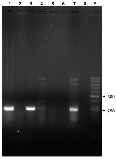 The presence of Pseudomonas spp. was investigated in 28 anoles, of which 12 were males, 12 females, and four juveniles. Pseudomonas spp. was detected in 18 animals (64.3%) based on the presence of the amplification of the expected 249 bp fragment of the oprI gene, present in all members of the genus Pseudomonas (Figure 3). Of these positive Anolis sp., eight were males (66.7% of the males studied), six females (50.0% of the females studied), and four juveniles (100%). In none of the cases was the amplification fragment of 504 bp of the oprL gene obtained and, therefore, none of the isolates corresponded to P. aeruginosa. Both weight and length were similar among the individuals with and without Pseudomonas sp.