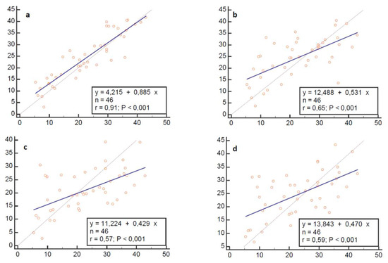 Linear regression analysis plots. Regression model: Alternative method (y) = a + b (Venco classic). Blue line represents line of equality (y = x). (a), Venco te-le; (b), Visser classic; (c), Visser le-le; (d), Visser te-le.