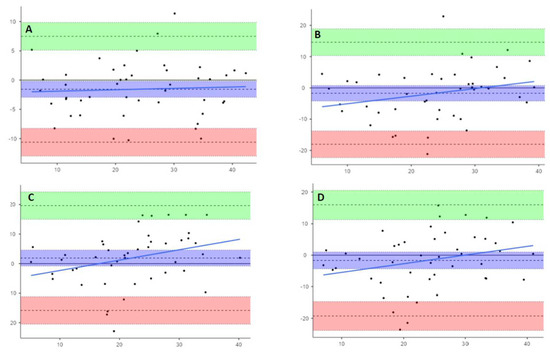 Bland–Altman plots showing paired difference between Venco classic and (A), Venco te-le; (B), Visser classic; (C), Visser le-le; and (D), Visser te-le. Upper and lower dashed lines show LoAs. Central dashed lines show the means of the differences. Light blue line is the proportional bias line. Light green and rose areas are the 95% Confidence Intervals of upper and lower LoAs. Purple area represents the 95% Confidence Interval of the mean of differences.