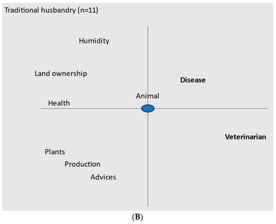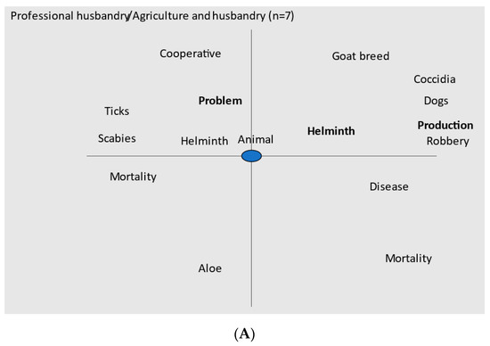 | Words Employed (in Percent) | Professional and Agriculture/Husbandry Farmers (n = 7) | Traditional Farmers (n = 11) | Significance (Chi-Square or Exact-Fisher Tests) |