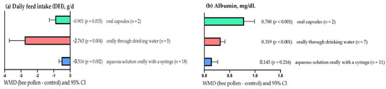 Figure 1a shows that DFI decreased (p < 0.05), regardless of how BP was supplemented. However, the effect was greater (WMD = –2.763 g/d; p = 0.004) when BP was administered orally via drinking water than when BP was supplemented via oral capsules (WMD = – 0.901 g/d; p = 0.015) or with BP in aqueous solution using an oral syringe (WMD = –0.516 g/d; p = 0.002). In contrast, a higher (p < 0.001) serum albumin concentration was observed in rabbits when BP was administered orally via drinking water (WMD = 0.319 mg/dL) and via capsules (WMD = 0.780 mg/dL; Figure 1b). However, serum albumin concentration was not affected with BP in aqueous solution using an oral syringe (WMD = 0.145 mg/dL; p = 0.216).
