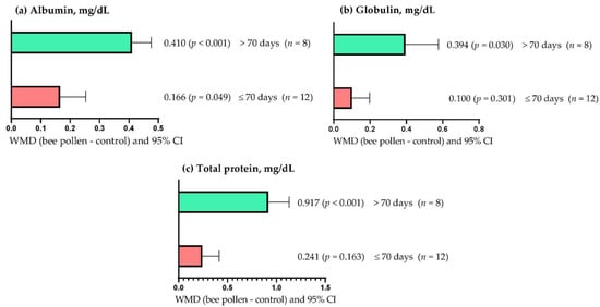 Figure 2a shows that the serum albumin concentration increased (p < 0.05), regardless of the supplementation period used; however, the effect was greater (WMD = 0.410 mg/dL) when BP was supplemented for more than 70 days than periods of up to 70 days (WMD = 0.166 mg/dL). On the other hand, the serum globulin concentration increased (WMD = 0.394 mg/dL; p = 0.030) when BP supplementation was longer than 70 days (Figure 2b). However, serum globulin concentration was not affected (WMD = 0.100 mg/dL; p = 0.301) when BP supplementation lasted up to 70 days. Figure 2c shows that serum total protein concentration increased when rabbits were supplemented with BP for more than 70 days (WMD = 0.917 mg/dL; p < 0.001). However, BP supplementation for up to 70 days did not affect serum total protein concentration (WMD = 0.241 mg/dL; p = 0.163).