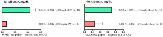 Figure 3a shows that serum albumin concentration increased when BP doses greater than 350 mg/kg BW were used (WMD = 0.434 mg/dL; p < 0.001). However, low doses (≤ 350 mg/kg DM) of BP did not affect serum albumin concentration (WMD = 0.072 mg/dL; p = 0.384). On the other hand, Figure 3b shows that the serum albumin concentration increased when BP was administered to rabbits older than 15 weeks of age (WMD = 0.434 mg/dL; p < 0.001). However, in rabbits up to 15 weeks of age, BP supplementation did not affect serum albumin concentration (WMD = 0.132 mg/dL; p = 0.186).