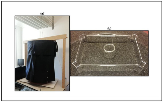 Experimental apparatus. (a) Setup from the outside. (b) Rectangular transparent arena with upright corridors at the corners. The transparent cylinder hosting the experimental fish at the beginning of each training trial is also shown (credit by Sara Boffelli).