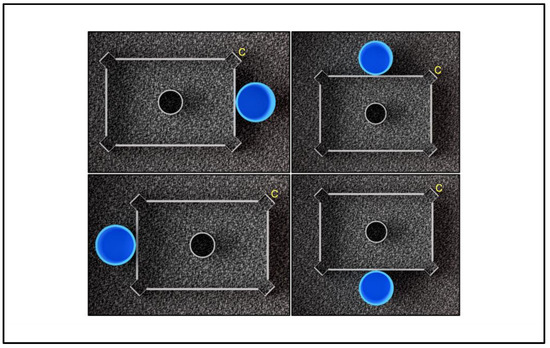 Four experimental conditions were designed (N = 4 each), which differed by landmark position in relation to the correct corner position and the arenas’ side: in the Proximal–Short (PS) condition, the landmark was placed near the correct corner position (from now labelled as “Correct” or “C”) on the short side of the arena; in the Proximal–Long (PL) condition, the landmark was placed near the Correct on the long side of the arena; in the Distal–Short (DS) condition, the landmark was placed far from the Correct on the short side of the arena; in Distal–Long condition (DL), the landmark was placed far from the Correct on the long side of the arena. See Figure 2.