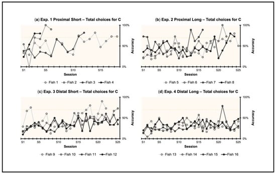 The individual learning curves for each experimental condition (PS, PL, DS, DL) are shown in Figure 3, considering the total choices (%) made by fish towards the Correct, as a measure of accuracy. Performance ≥ 70% was obtained in the Proximal–Short (4/4 fish), Proximal–Long (3/4), and Distal–Short (1/4) conditions. No fish met the learning criterion in the Distal–Long condition.