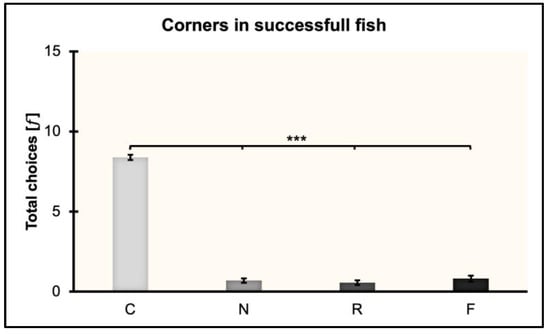 The total choices (𝑓) made by fish towards the four corners (C, N, R, F) were analyzed to evaluate reorientation behavior within the non-visual geometric frame (rectangular transparent arena) equipped with the visual 3D landmark (blue cylinder) in the training sessions that all the fish had in common (the last four). Note that to compare the choices towards the corners, the same number of sessions that all the fish (successful and not) had in common was needed. Since one of the animals learned in just four sessions, the last four training sessions were analyzed, including the learning and validation sessions, plus the last two before learning for successful fish and from session 22 to session 25 for unsuccessful fish.