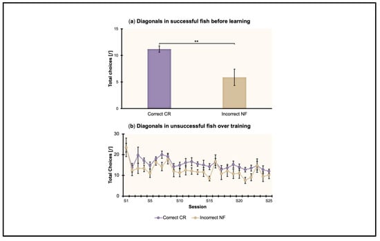 Total choices for the diagonals (geometry alone) in the 8 fish achieving the learning criterion ≥ 70% for C (a) and in the 8 fish not achieving it (b). Mean ± SEM are shown. Significant p values are indicated with asterisks (** p = 0.001).