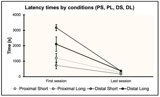 3.5. Latency Times by Conditions (PS, PL, DS, DL) in the First and Last Training Sessions