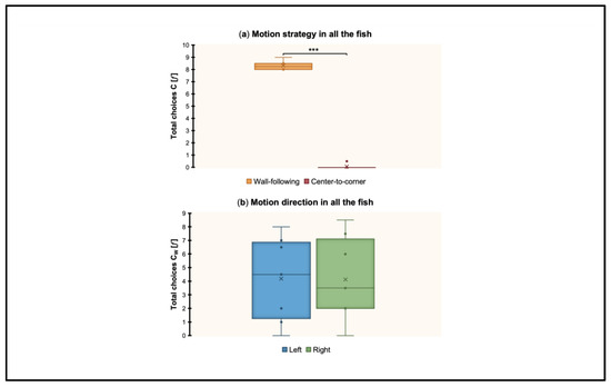 The total choices (𝑓) made by fish towards the Correct were analyzed to evaluate if a consistent motion strategy (wall-following vs. center-to-corner) and motion direction (left vs. right) were used by fish once they had learned to reorient within the non-visual geometric frame (rectangular transparent arena) equipped with the visual 3D landmark (blue cylinder). Results are shown in Figure 7.