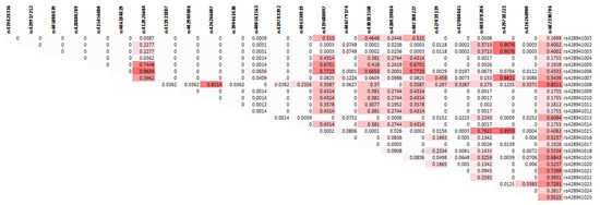 The linkage disequilibrium plot (p value) among all the SNPs in MTNR1A gene sequence found in our study.