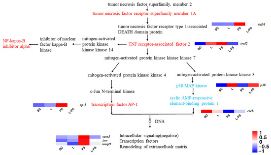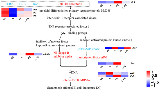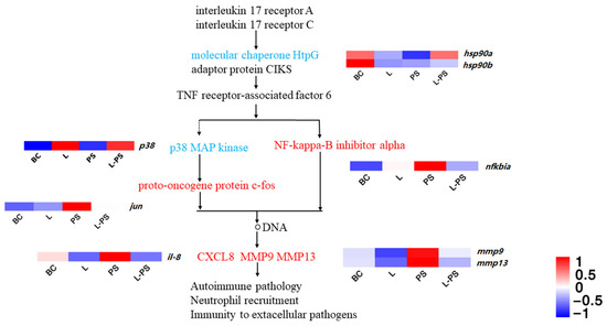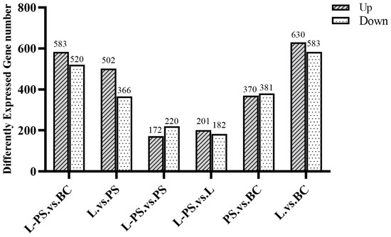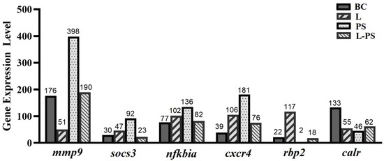 3.3. Differentially Expressed Genes (DEGs) Regulated by Exposure of P. shigelloides and Lactobacillus