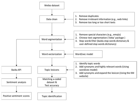 To identify the concerning subtopics within each record, thirteen lexicons (one for each subtopic) were developed for matching. Each lexicon was developed following three steps. For example, to develop a lexicon for matching the subtopic ‘Humans get close to cats’, words with the meanings of “pat/petting” were included in the lexicon as keywords. Secondly, using the word2vec model, words with similar meanings or high relevance of keywords were retrieved and added to the lexicon. In the third step, using the KM website (https://kmcha.com/ accessed on 15 September 2022), we searched for synonyms of keywords and expanded the lexicon. Subsequently, the lexicon was used for identifying this subtopic in the test dataset (490 manually coded records). Its performance was calculated using an accuracy score.