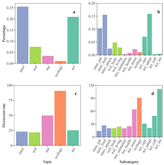 The percentage and discussion rate of identified topics. (a) The topics of human-stray cat interactions and actions to be taken for stray cat management took the largest percentage in public discussion. (b)The subcategories “Stray cat adoptions”, “Humans get close to stray cats”, and “Humans give food to stray cats” took the largest percentage in public discussion. (c) The topics “ecological impacts” and “public nuisances” had the highest discussion rate. (d) The subcategories “To take the TNR method for managing stray cat population”, “The ecological impacts”, and “Stray cats making noise” had the highest discussion rate.