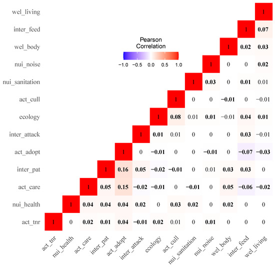 The correlation matrix revealed the co-occurrence pattern of each pair of subcategories in public discussion. The correlation analysis results indicated that the subtopic “Stray cat adoptions” was positively correlated with “Care for stray cats” (r = 0.15) and “Humans get close to stray cats” (r = 0.16), but negatively correlated with “Humans give food to stray cats” (r = −0.07) (We only present correlations with |r| ≥ 0.05 in text, see Figure 3 for a complete correlation matrix). The subtopic “Care for stray cats” was positively correlated with “Humans get close to cats” (r = 0.05) and “Cats’ physical body conditions” (r = 0.05), but negatively correlated with “Humans give food to stray cats” (r = −0.06). The subtopic “To take lethal control methods” was positively correlated with “The ecological impacts” (r = 0.08).