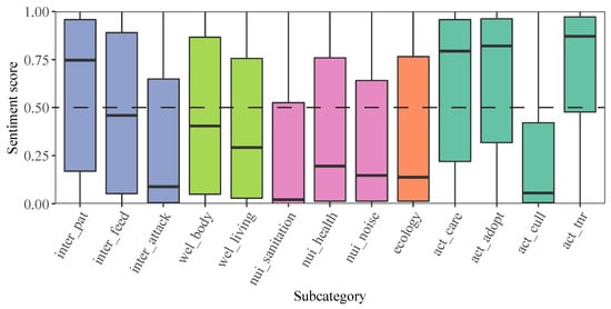 The sentiment analysis results revealed that in most subtopics, public emotions tended to be negative (Figure 4). The medians of sentiment scores showed that public emotions tended to be positive to four subtopics: “Humans get close to cats” (median = 0.75), “Care for stray cats” (median = 0.79), “Stray cat adoptions” (median = 0.82), and “To take the TNR method for stray cat management” (median = 0.87). Six subtopics including “Cats attack humans” (median = 0.09), “Public sanitation” (median = 0.02), “Public health” (median = 0.2), “Cats making noise” (median = 0.15), “The ecological impacts” (median = 0.14), and “To take lethal control methods for stray cat population management” (median = 0.06) showed median sentiment scores less than 0.25, indicating public emotions towards these topics tended to be negative.