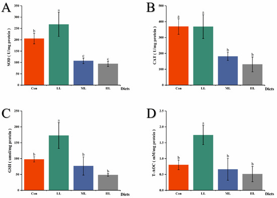Compared with the control group, juvenile largemouth bass in the LL group exhibited considerably higher SOD, GSH and T-AOC activity, while fish in the ML and HL groups displayed significantly lower SOD and CAT activity (p < 0.05) (Figure 1).