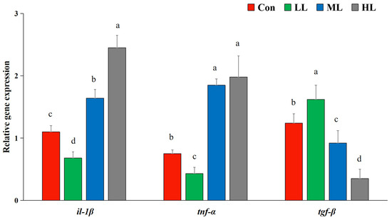 The expression of il-1β and tnf-α was dramatically down-regulated in fish of the LL group, while it sharply increased in fish of the ML and HL groups (p < 0.05). Meanwhile, dietary LAM inclusion substantially increased the expression of tgf-β in fish of the LL group (p < 0.05) (Figure 2).