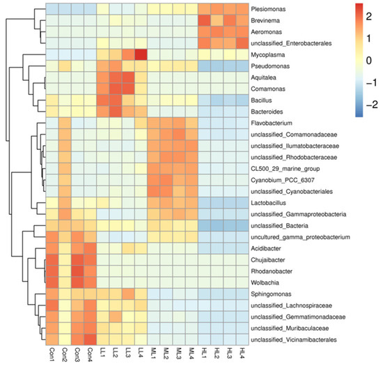 The heat map of intestinal microbiota of largemouth bass fed with four experimental diets. Con means control diet. LL, ML, and HL mean 5 g Kg−1, 10 g Kg−1 and 15 g Kg−1 laminarin was supplemented into diets, respectively.