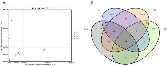 The principal component analysis and Venn diagram of intestinal microbiota of largemouth bass. (A) The principal component analysis. (B) The Venn diagram. Con means control diet. LL, ML, and HL mean 5 g Kg−1, 10 g Kg−1 and 15 g Kg−1 laminarin was supplemented into diets, respectively.