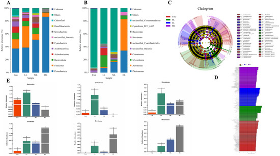 Moreover, the Venn diagram showed that fish in the control group had the largest number of OTU, while fish in the LL group exhibited the minimum OTU (Figure 4B). MCBP displayed that Proteobacteria was the dominant phyla in the control and LL groups, followed by Firmicutes and Bacteroidetes at phylum level (Figure 5A). The Firmicutes/Bacteroidetes ratio in the control, LL, ML and HL groups was 1.40, 4.00, 0.88 and 19.05, respectively (Table S2). Moreover, unclassified_Bacteria was the major taxon, followed by unclassified_Cyanobacteriales and Bacteroides in the control group. Mycoplasma was the main taxon in the LL group, followed by Comamonas and Plesiomonas. Plesiomonas was the dominate taxon in the ML group, followed by unclassified_Cyanobacteriales and Cyanobium. In the HL group, Aeromonas was the primary taxon, followed by Plesiomonas and Mycoplasma at genus level (Figure 5B). The LEfSe analysis showed that the Bacteroide, Comamonas and Mycoplasma content in the LL group, and the Aeromonas, Brevinama and Plesiomona content in the HL groups, was remarkably higher than that of the control at genus level (p < 0.05) (Figure 5C–E).