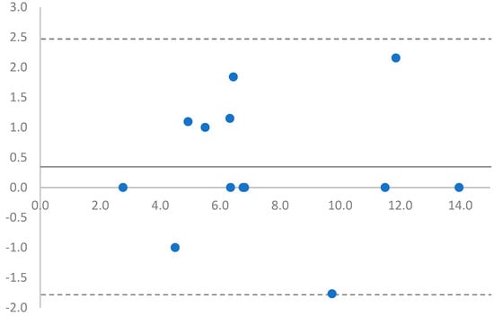 Analyses were computed using Excel (Microsoft 365, Redmond, WA, USA) and Real Statistics add-in software (https://www.real-statistics.com/free-download/real-statistics-resource-pack/ (accessed on 9 May 2022)). Spearman correlation coefficients (rs) were obtained to measure the linear association of Westergren and micro-ESR methods. An rs value of 0.80 to 1.0 was considered very strong correlation; 0.60 to 0.79 was moderate correlation; 0.30 to 0.59, fair correlation; 0.10 to 0.29, poor correlation; and 0.00 to 0.09, no correlation []. Passing–Bablok regression analysis was used to estimate constant and proportional bias between methods. Constant bias indicates that micro-ESR method consistently measures ESR to be higher or lower in comparison with the Westergren method. If the confidence interval for the y-intercept did not include the value 0, this was considered evidence of constant bias. Proportional bias indicates that the differences in measurements of each method are proportional to the level of measurement. If the 95% confidence interval for the slope did not include the value of 1, this was considered evidence of proportional bias. Bland–Altman plots were used for visualization and quantification of the agreement of the results between methods.