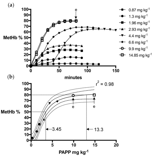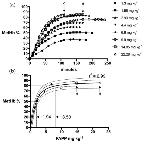 Oral PAPP dose in mg kg−1 formulated with DMSO estimated to produce 50% (MetHb50) and 80% (MetHb80) MetHb based upon fitted models with upper and lower prediction estimates (p < 0.05).