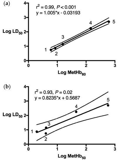 Log MetHb80 estimates based upon dose response data obtained in wild dogs, foxes, feral cats, brushtail possums and brown rats regressed strongly and significantly with log LD50 data published for these five species (r2 = 0.99, p = 0.001). Regression of LD50 values with the doses of PAPP modelled to cause a 50% elevation in MetHb (MetHb50) produced a weaker correlation (r2 = 0.93, p = 0.024) with 95% confidence intervals and prediction boundaries indicating a less reliable predictive capacity for the MetHb50 estimate (Figure 5a,b).