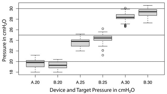 Boxplot illustrating the performance of both devices (A = device A; B = device B) at target pressures of 20, 25 and 30 cmH2O.