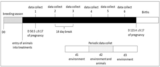 Representation of the breeding season scheme, periodic collections (main and microclimatic), and calving period.