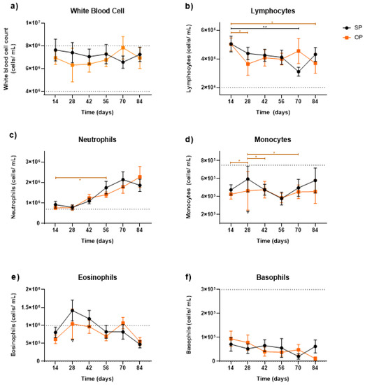 The OP system presented lower monocyte recruitment than the SP system on day 28 (p = 0.0119; Figure 3d). Nevertheless, this day contrasted significantly with days 14, 42, and 70 (p = 0.0476; p = 0.0387; p = 0.0206, respectively). As for the eosinophils, an effect of interaction between systems and time was observed (p = 0.0398; Figure 3e). The mobilization of the SP cells on days 28 and 42 were slightly above the upper reference limit, having a statistical distinction from the OP on day 28 (p = 0.0424). Finally, the only effect of interaction was detected for the basophils (p = 0.0325; Figure 3f).