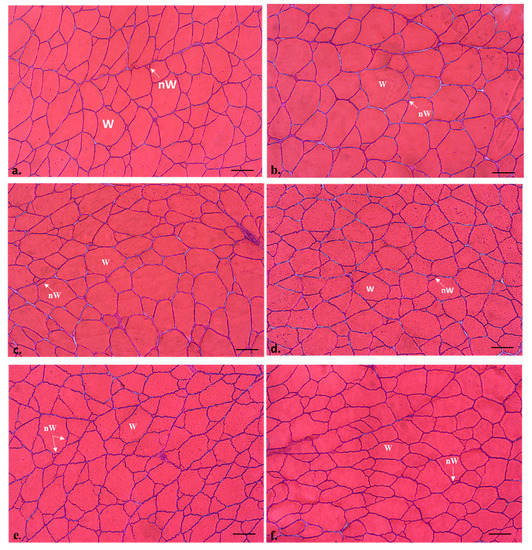 Transverse sections of the white muscle of commercial-size gilthead sea bream (1.6-year-old adult specimens), from C (a), R2.5 (b,c), H2.5 (d), and H5 (e,f) groups. Hematoxylin-Eosin staining. W: white muscle fibres; nW: new white muscle fibres. The white muscle fibres density was higher in the H2.5 and H5 groups (d–f) than in the other groups (a–c). Bars 100 µm.