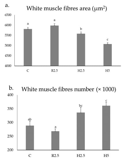Mean ± SEM values of the area of the white muscle fibres (a) and number of the white muscle fibres (b) of 1.6-year-old adult specimens of Sparus aurata from the C, R2.5, H2.5, and H5 groups. Different lower-case letters indicate significant differences (p < 0.05) between groups for each parameter. Mean values were obtained from nine specimens per group.