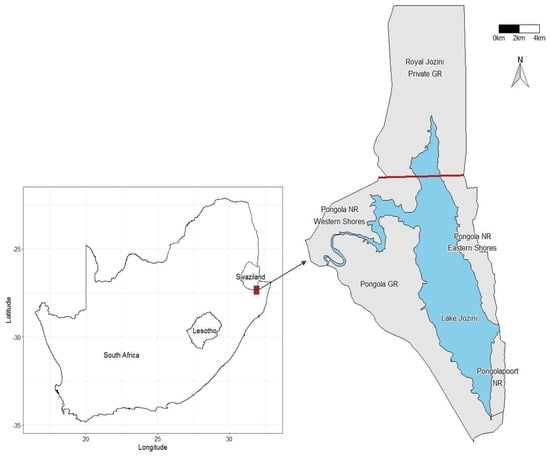 The Pongola Game Reserve (PGR) is a small (~10,000 hectares) [50] private reserve situated in northern KwaZulu-Natal, South Africa (Figure 1). PGR is fenced at the south and west and bounded by the Pongola River to the north and Lake Jozini to the east. The lake straddles the international border between South Africa and Eswatini and is surrounded by a matrix of private and provincial reserves.