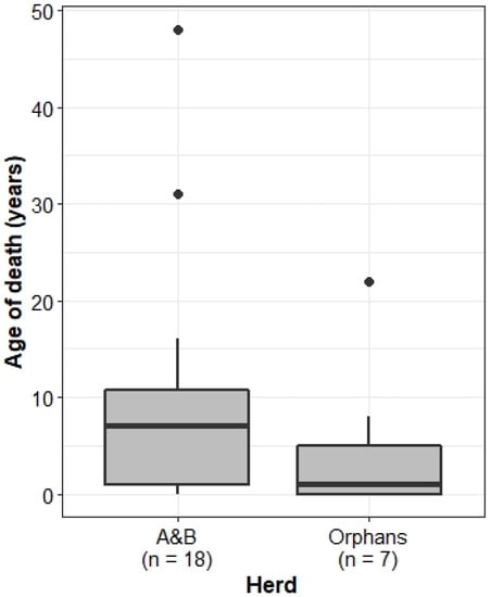 Whilst the median age of death was lower for the Orphans (1 year old) than the A&B herd (7 years old), this difference was not significant (Wilcoxon rank sum test: W = 84.5, p = 0.1986) (Figure 2). Of all calves born to the Orphans, 21% died ≤2 years of age (n = 5 of 24), whilst in the A&B herd, only 9% of individuals died as infants (n = 7 of 78), although these differences were not significantly different from expected values (Chi-squared test: X2 = 1.4305, df = 1, p = 0.2317).
