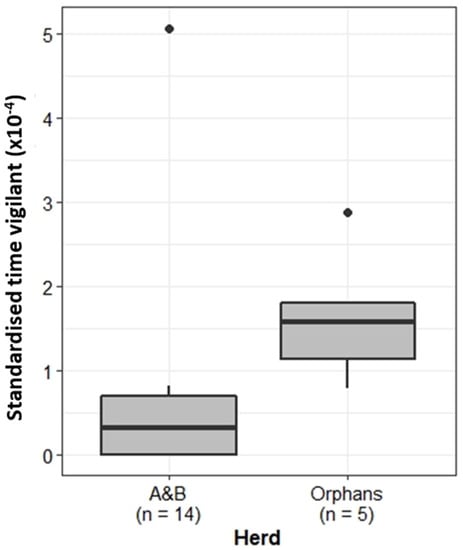 Proportion of time the A&B herd and Orphans spent exhibiting vigilance behaviour. Boxplots show median, IQR, and outliers. Numbers on the x-axis indicate the number of individuals included in the analysis for each herd.